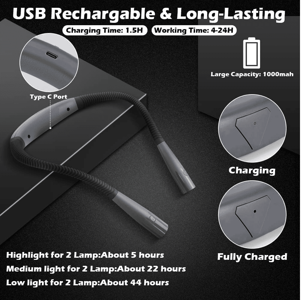 - Rechargeable Power Source: This neck reading light is equipped with a rechargeable battery, eliminating the need for frequent battery replacements. A single charge supplies ample energy to keep the light brightly shining for hours.