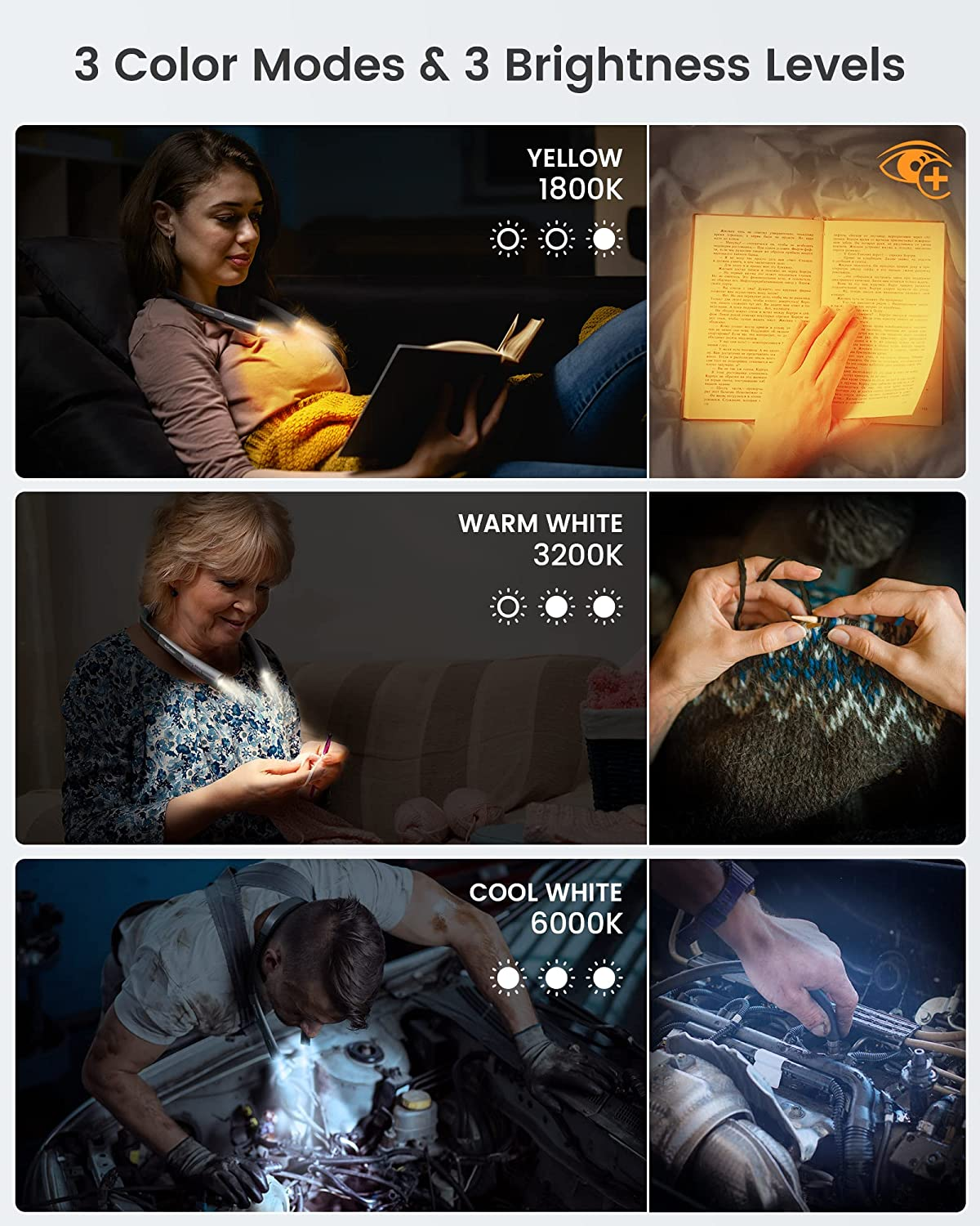 - Varied Lighting Modes: The Upgraded LED Neck Reading Light features multiple lighting modes, including white light, warm light, and a combination of both, granting you the flexibility to adapt to different lighting requirements.